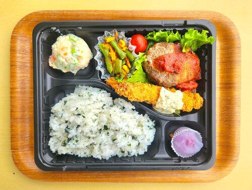 「お品書き」 ・わかめご飯 ・エビフライ ・トマトソースハンバーグ ・枝豆入りポテトサラダ ・いんげんの胡麻和え